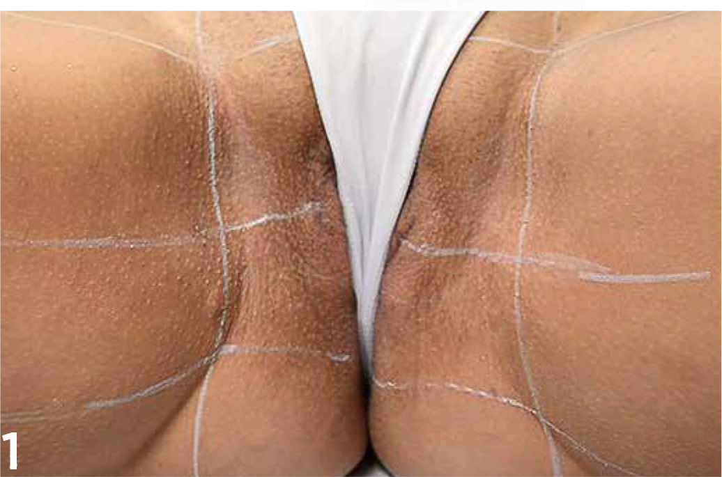 Пациент — женщина, 44 года. Жалобы на потемнение кожи в аногенитальной зоне. После вторых родов восемь лет назад цвет кожи в интимной зоне стал темнее обычного. Предпочитает носить обтягивающее бельё [Фото 5].