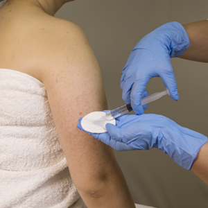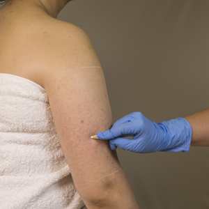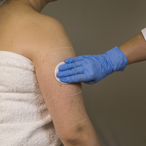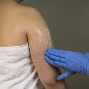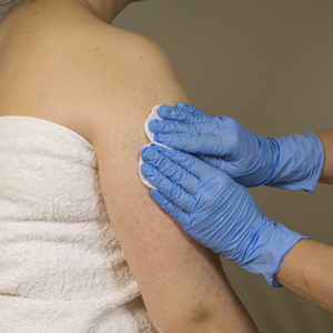 Шаг второй — разметка зоны. Перед нанесением пилингового состава проводится разметка зоны, где будет проходить процедура. Всю поверхность плеча делим на одинаковые участки, это удобно при нанесении состава.